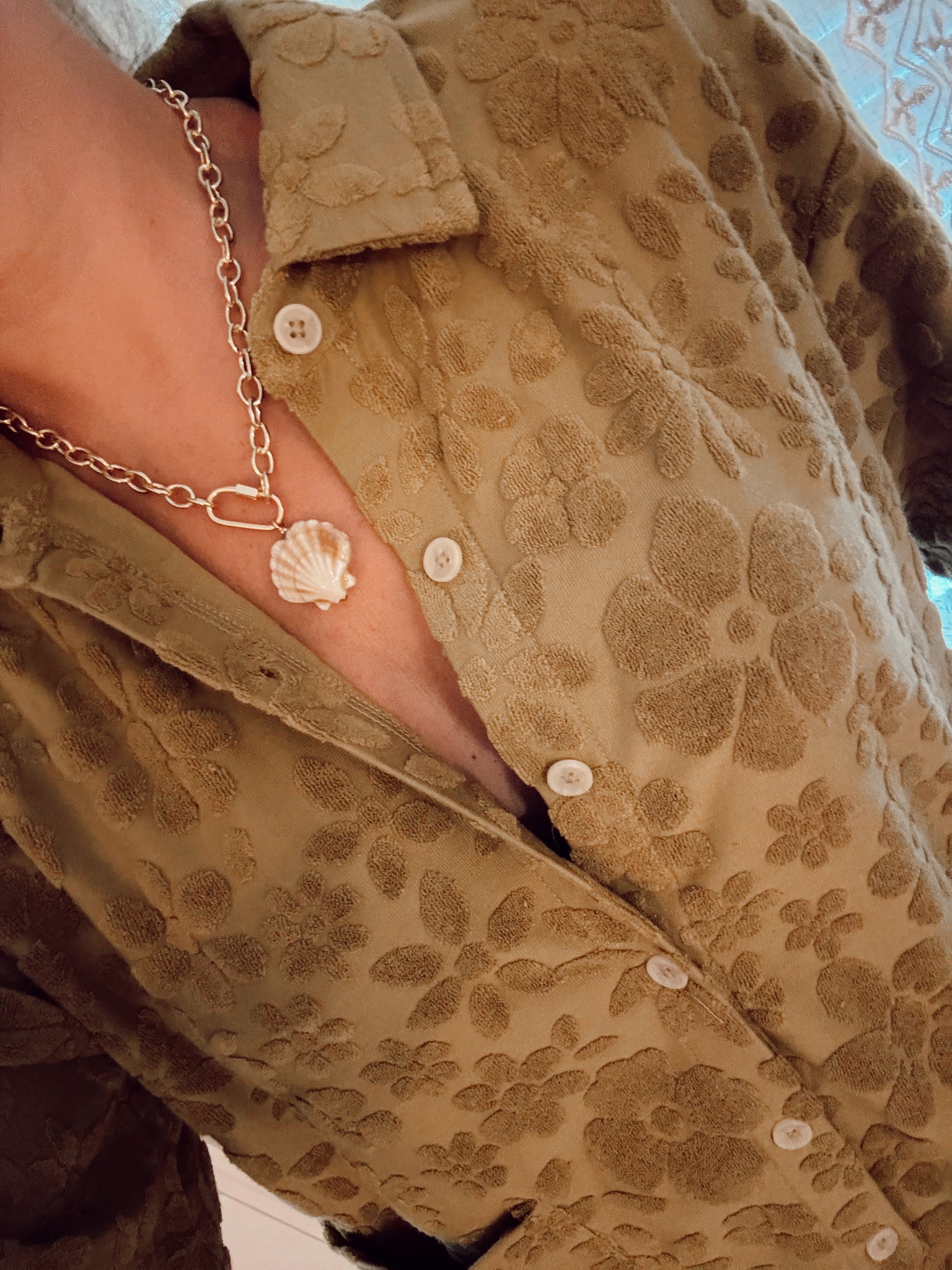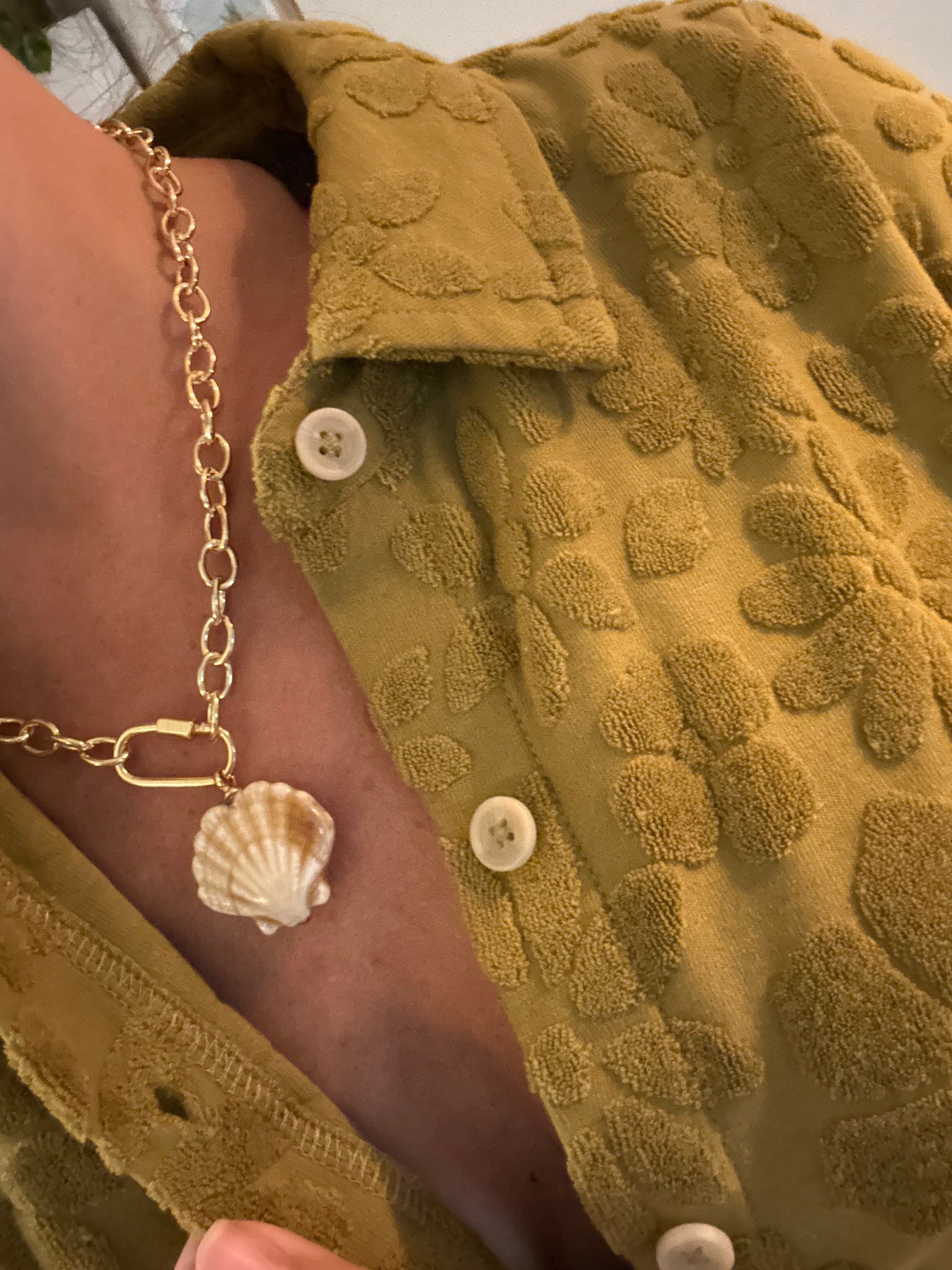 chunky 18 inch gold filled chain with a carabiner and ceramic shell pendant! we LOVE this statement necklace