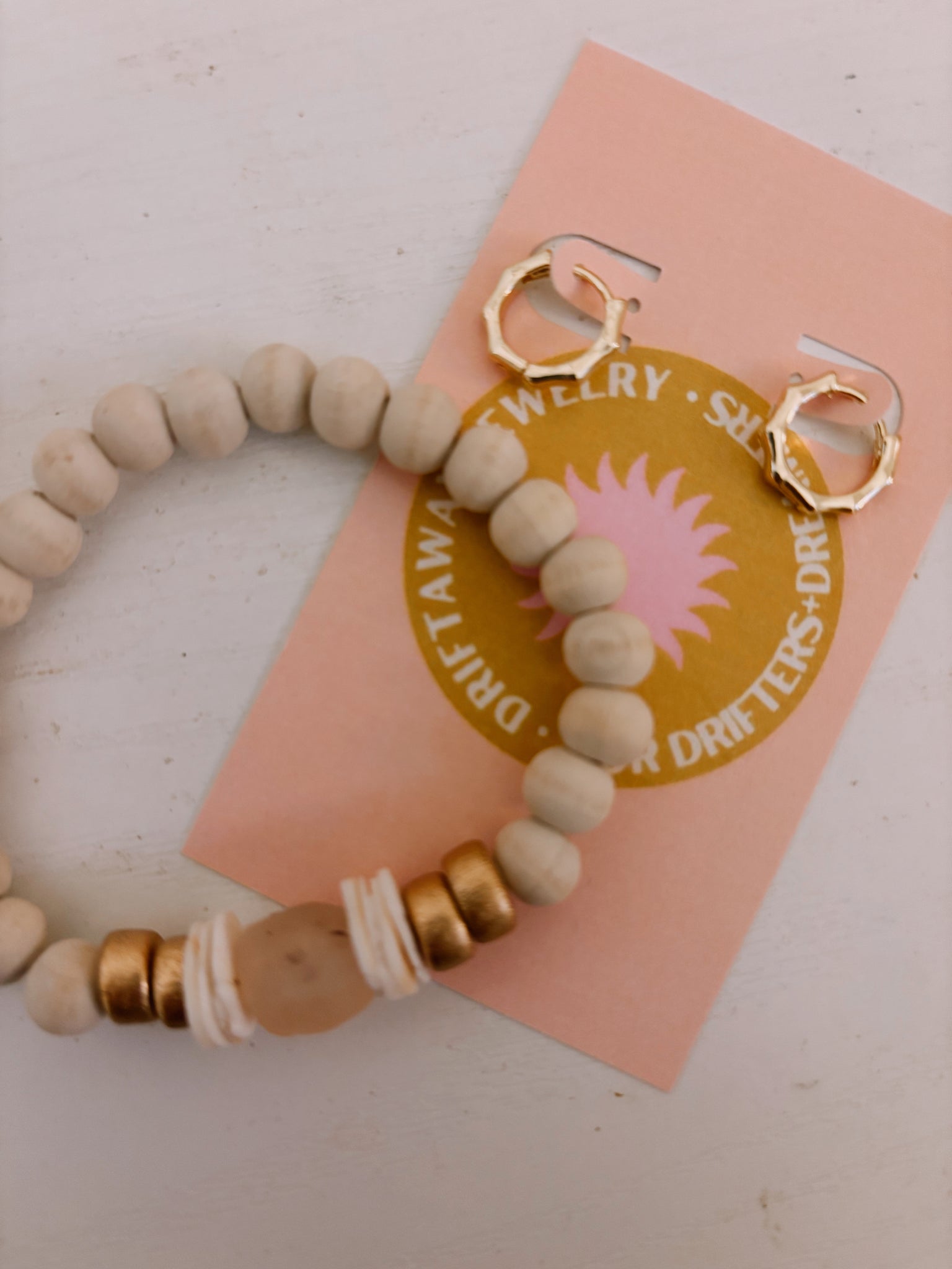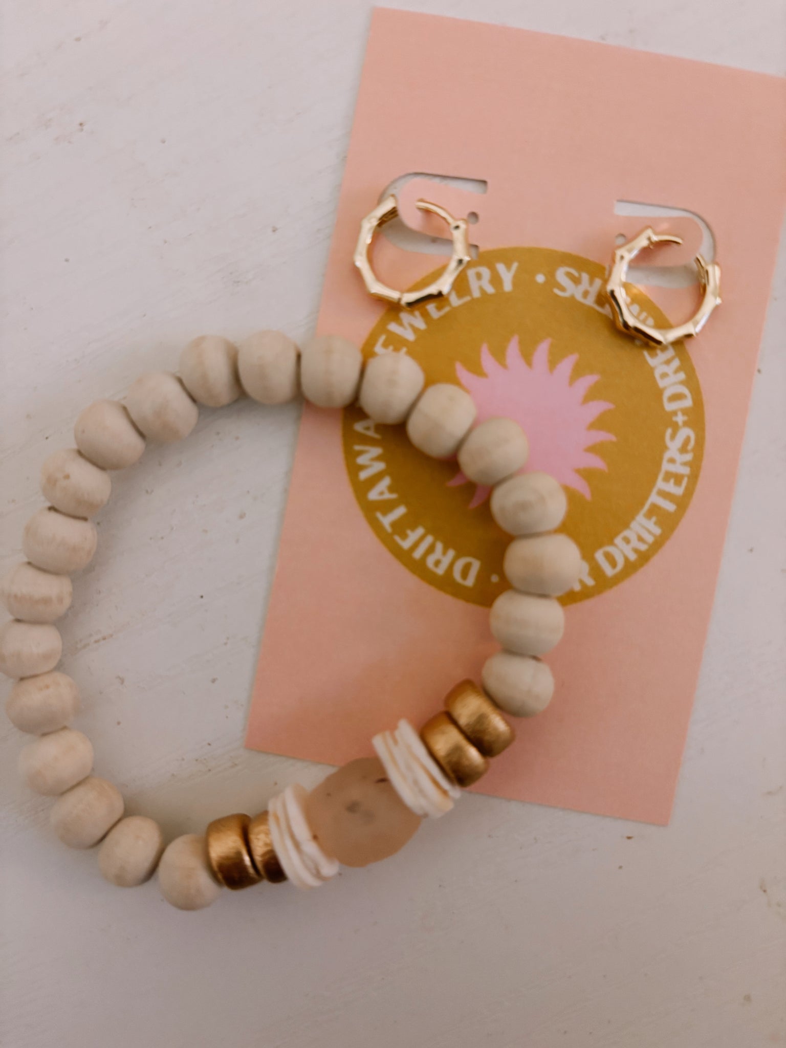 option one: Neautral! A wood and recycled pink glass bracelet with a simple pair of gold filled huggies
