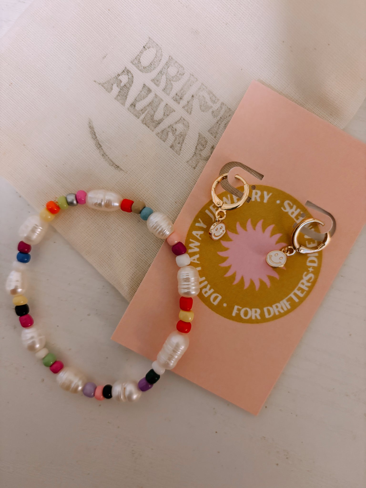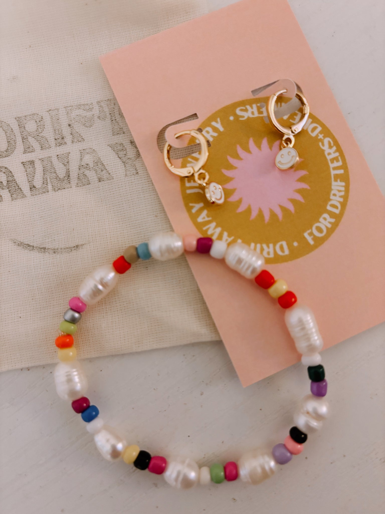 option two: Colorful! a pearl and colorful beaded bracelet with a pair of smiley huggie earrings